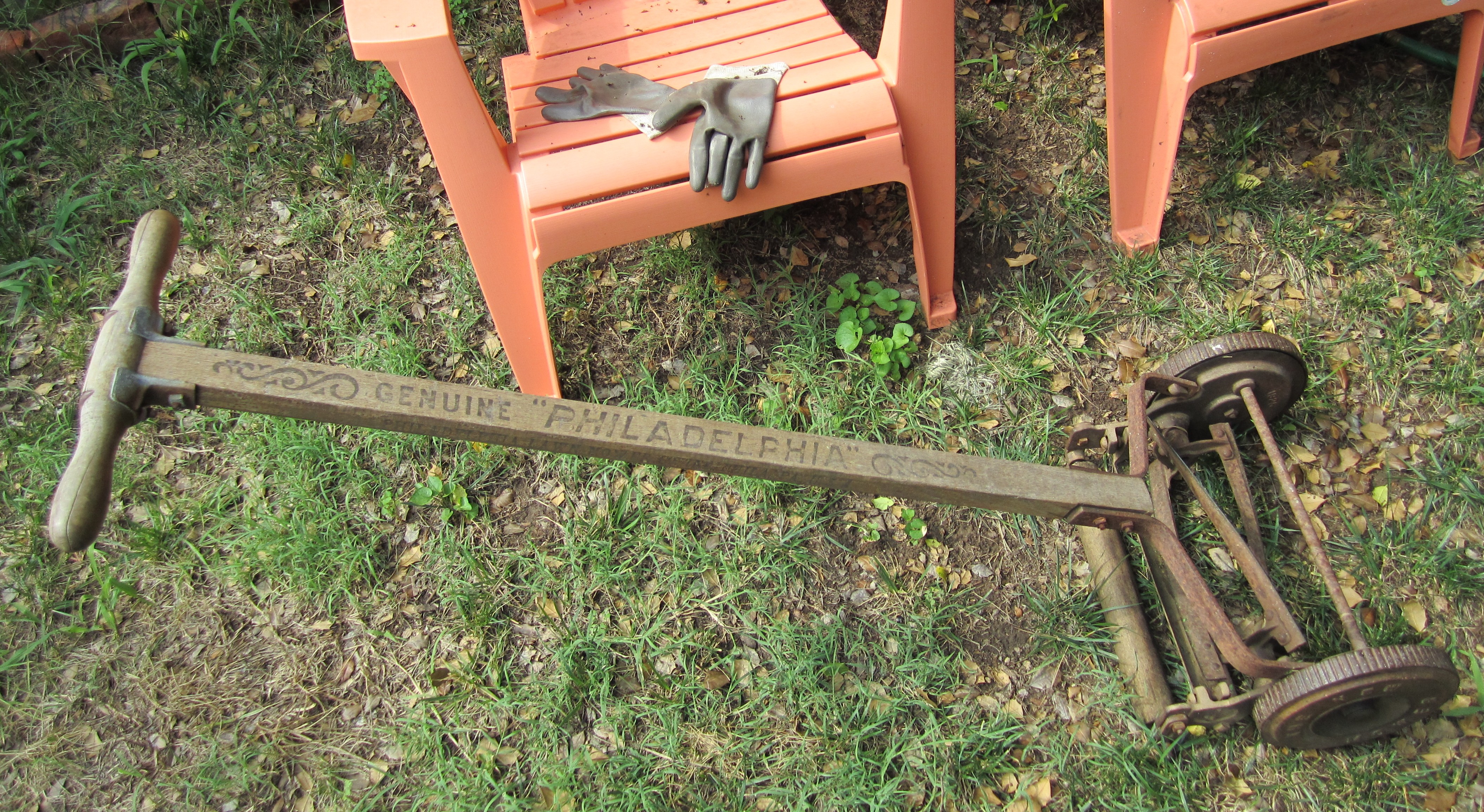 It’s also that we cut the grass with an antique reel lawnmower that my father gave me. I believe it belonged to my grandfather. It weighs 26 very awkward pounds (feels like 50, as they say about the weather). But I use it for sentiment, and because I think it’s rather beautiful, and because I can’t resist a free tool.