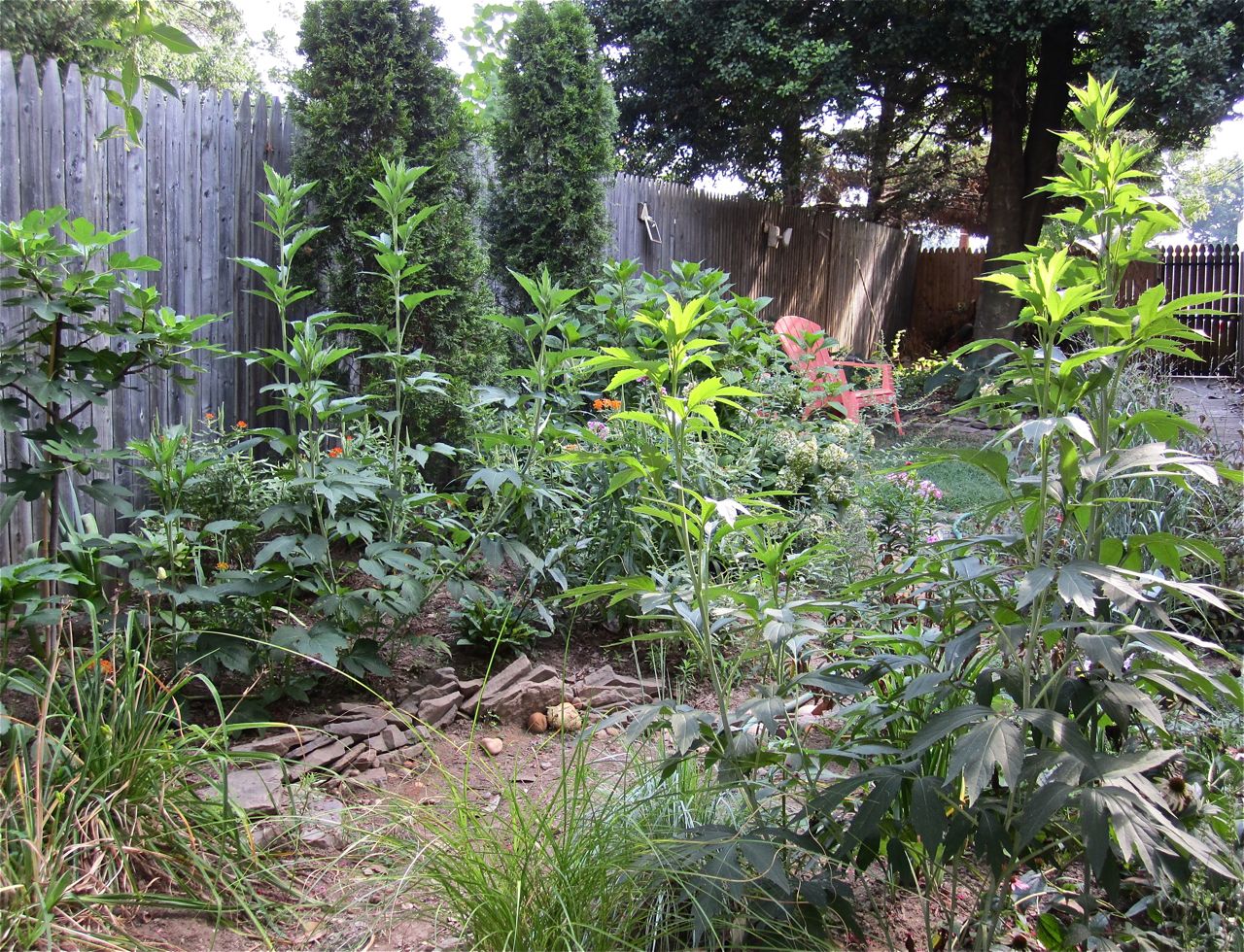 Asclepias tuberosa (butterfly milkweed) after flowering.My little ‘Brown Turkey’ with figs.Still no gravel in the path, but the Rudbeckia laciniata look great and are about to bloom.