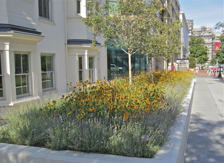 Yesterday evening, I spotted this very simple, very pretty combination of black-eyed Susans and lavender on the corner of 18th and F Streets, not far from the Old Executive Building. The three small trees are crabapples.