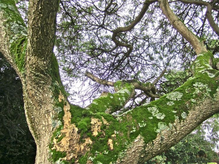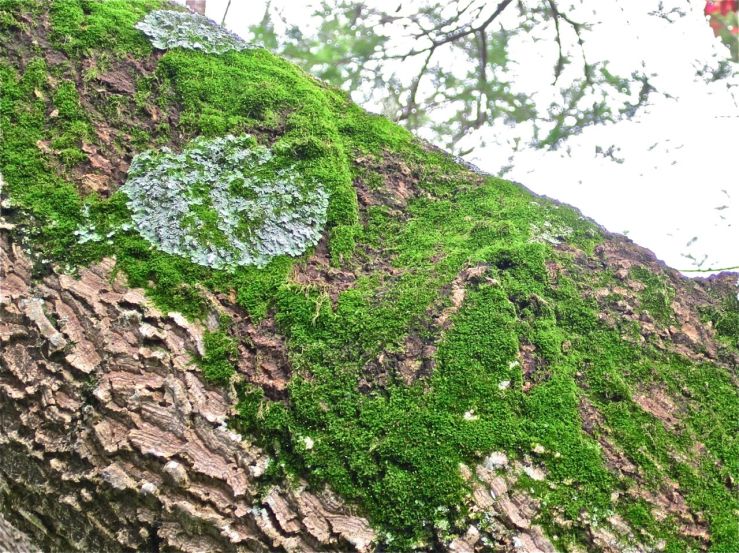 The acacia tree in our garden doesn’t have as pretty a form as the one above — it needs some pruning — but after 3 months of daily rain, its trunk is blanketed with moss spotted with lichen.