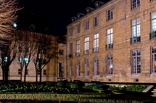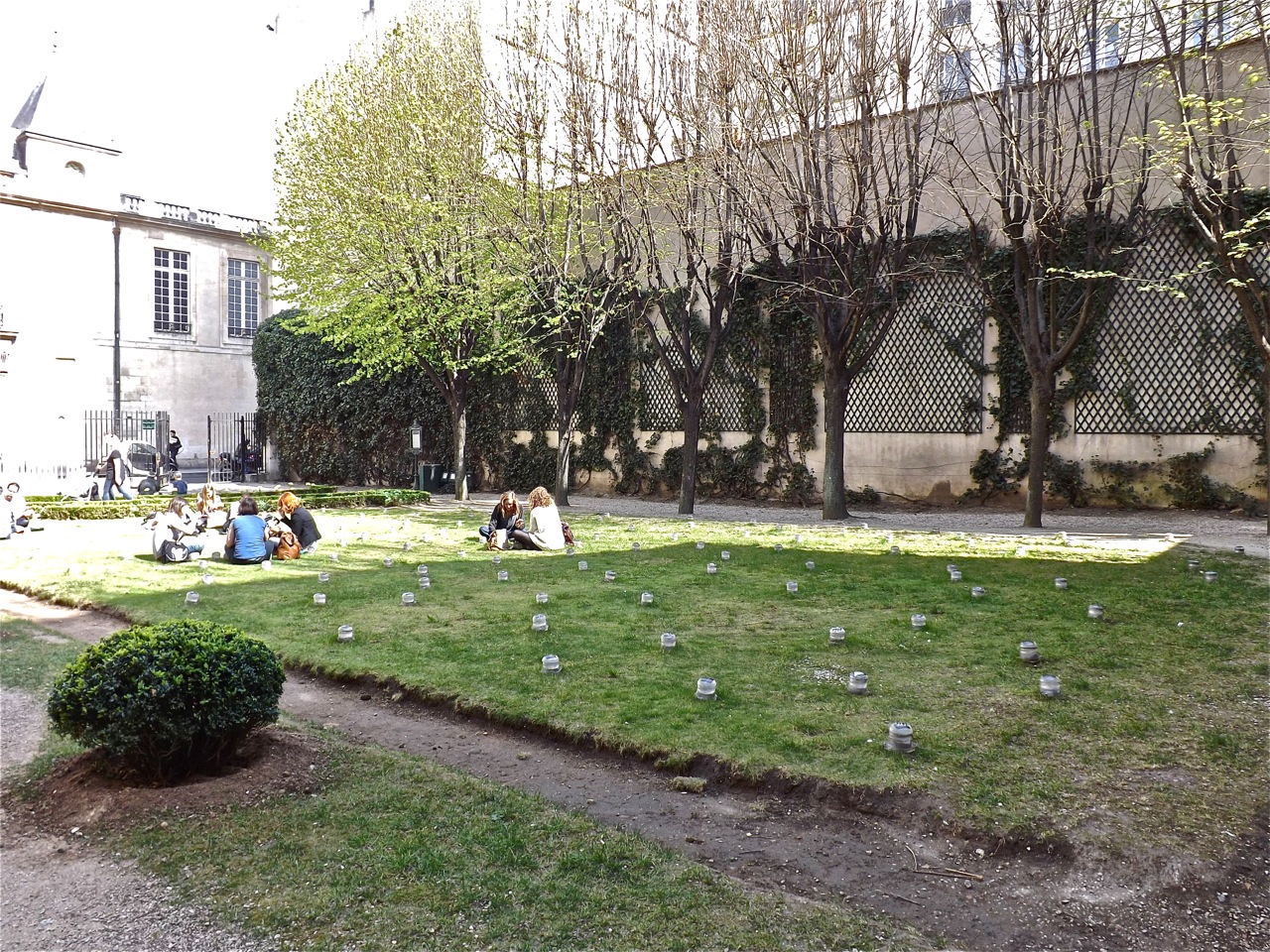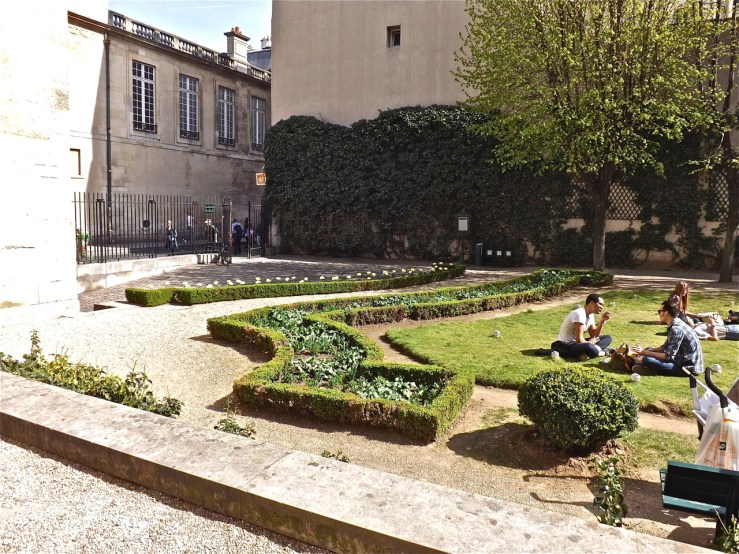 This petit park, which is the courtyard of the 16th c. Hôtel de Lamoignon in the Marais, is very traditionally landscaped with lined-up trees, clipped shrubs, decorative trellis, and lawn.
