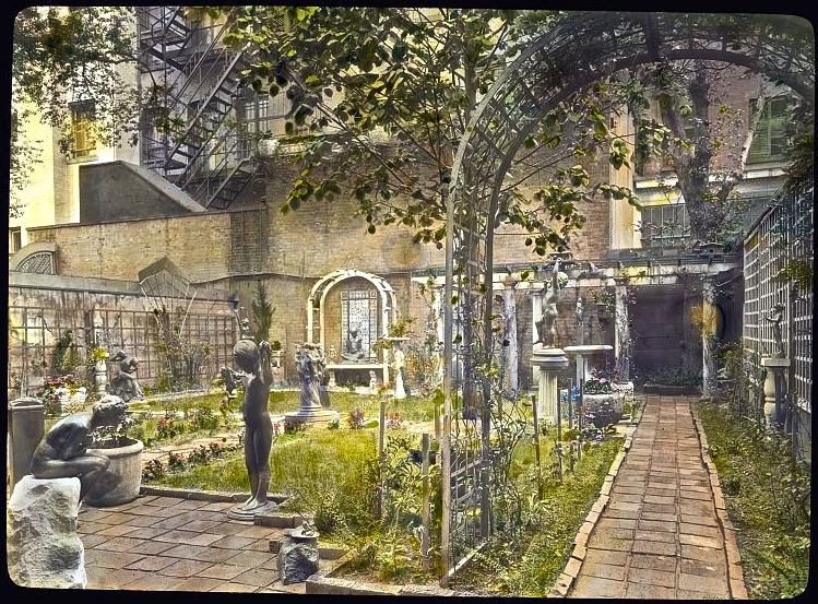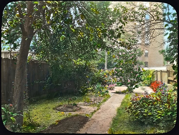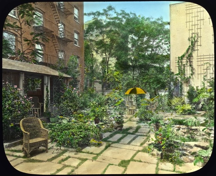 The Library of Congress is the repository of Johnston’s personal papers and approximately 20,000 photographs. But the lantern slides lacked garden names, locations, and dates and, therefore, had not been released to  general public access.  Watters took on the challenge of cataloging the collection, and after five years of research in libraries and archives, he has transformed vague earlier library notations into detailed data.  For example, an unlabeled slide was recognized as a prize winner in a 1922 design contest and is now identified as “The Janitor’s Garden, 137 E. 30th St., New York City.”