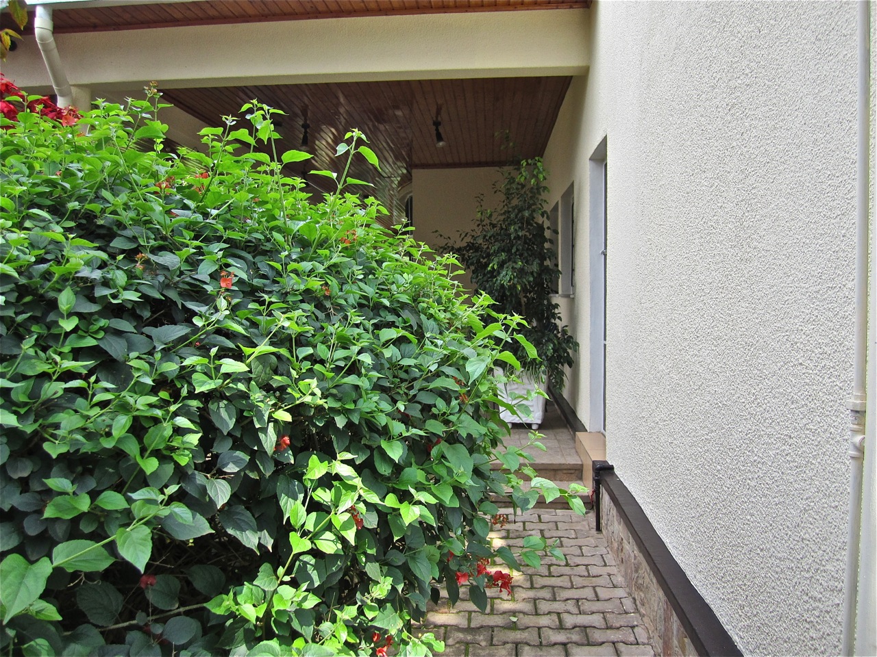 Above, going back up to the terrace and walking its length to the opposite end of the house, the path to the side yard is almost blocked by a very large, very clipped shrub (also shown below).