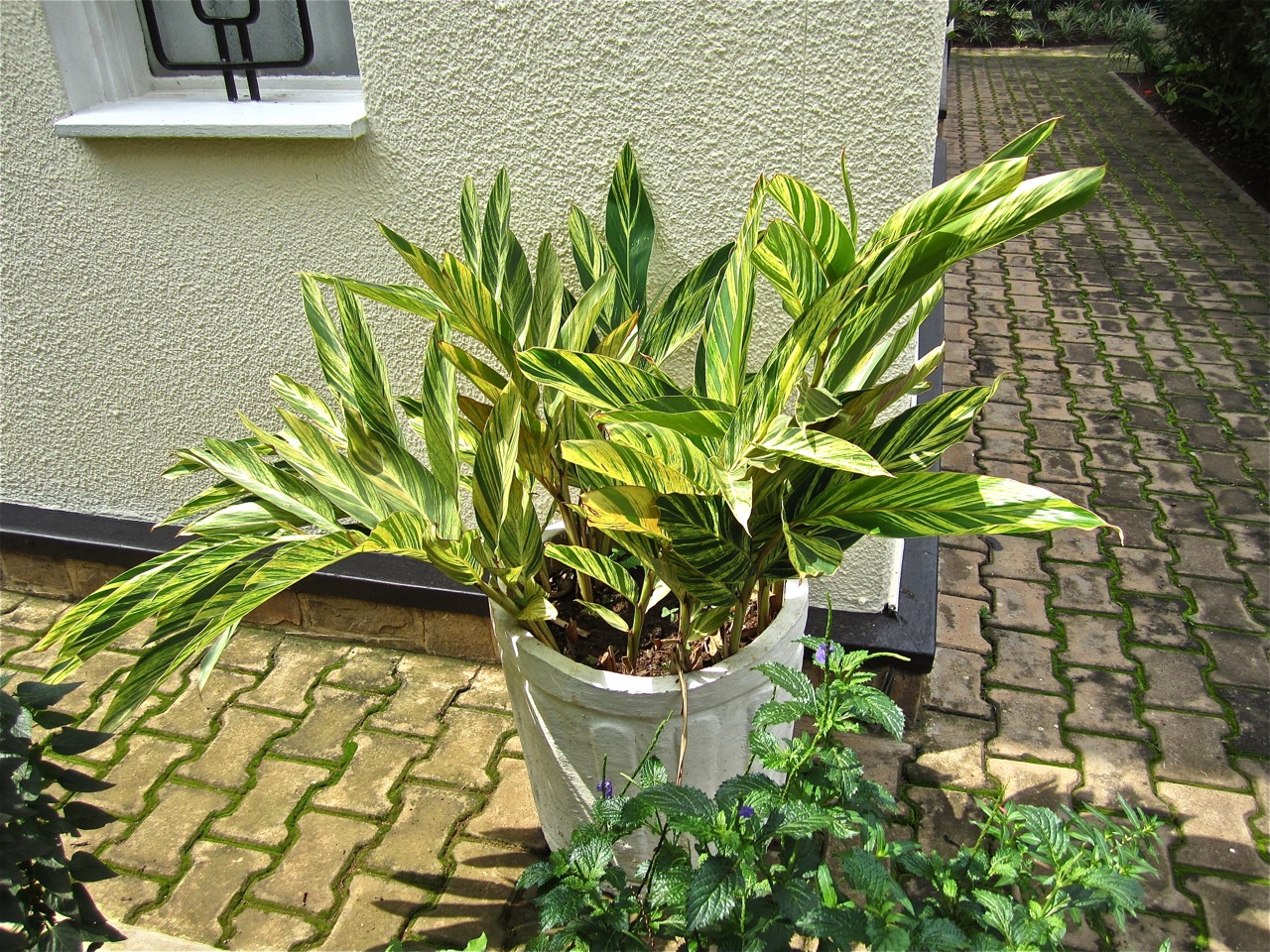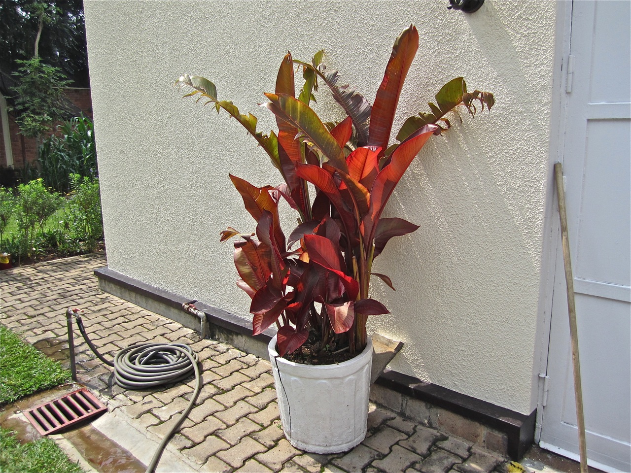 There are a number of potted plants in the garden, including these two (below), which have been left at the back of the house.  They hold burgundy cannas (which are breaking their pot) and bright variegated gingers, but almost no one sees them.  On the terrace, we also have variegated yuccas planted in very nice tall pots, but so deeply that only the ends of their squished up spiky leaves show (and they’re  a bit dangerous at upper-body level).