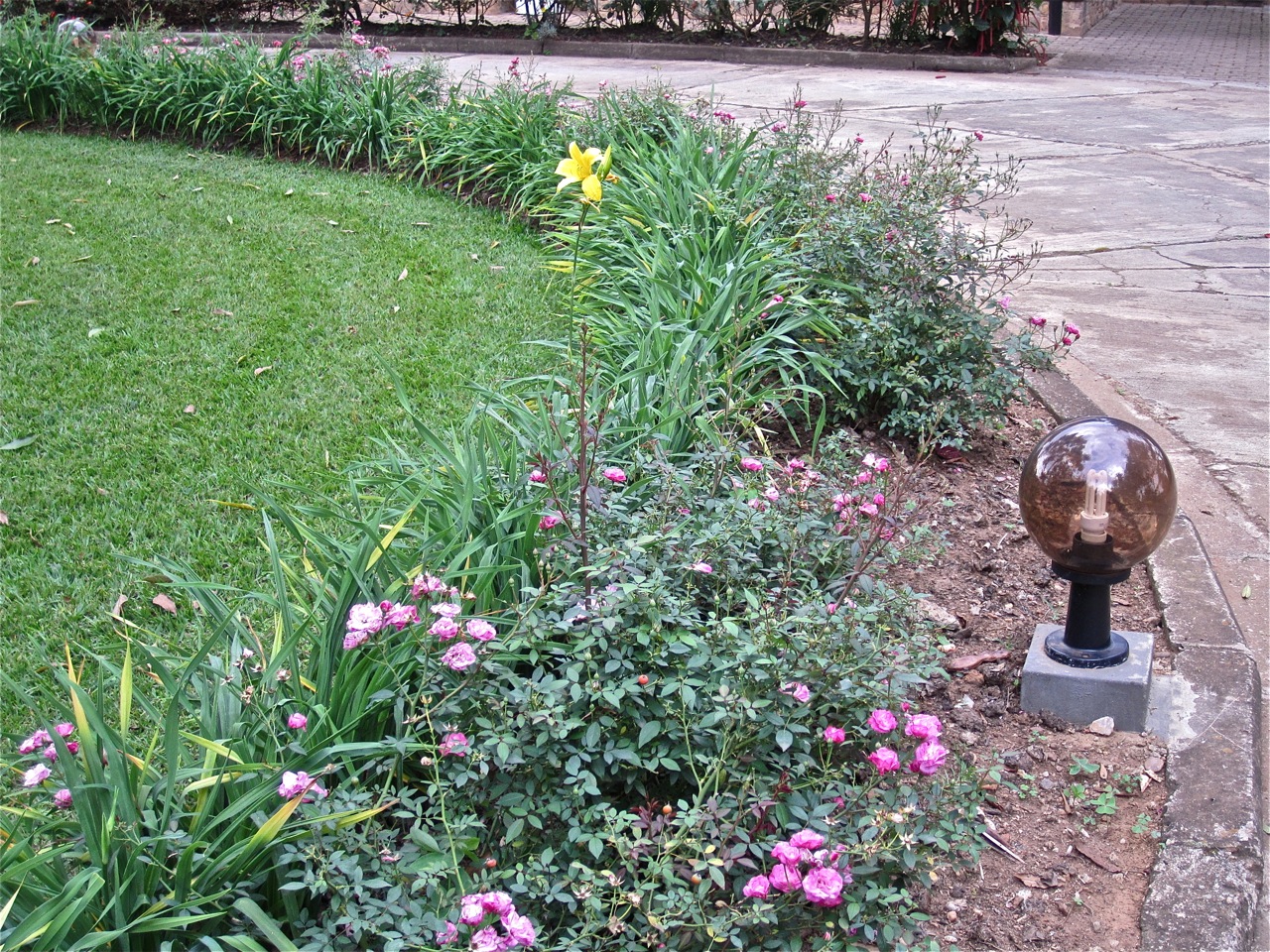 In the semi-circle, shown above and below, the miniature pink shrub roses (possibly “The Fairy” variety) are planted in a line along the curb, and the yellow day lilies are lined up right behind them.  I’m not fond of the yellow/pink combination, but my main concern is that the single-file arrangement  — the first thing you see when you walk or drive into the enclosure — is skimpy and makes a weak  impression.