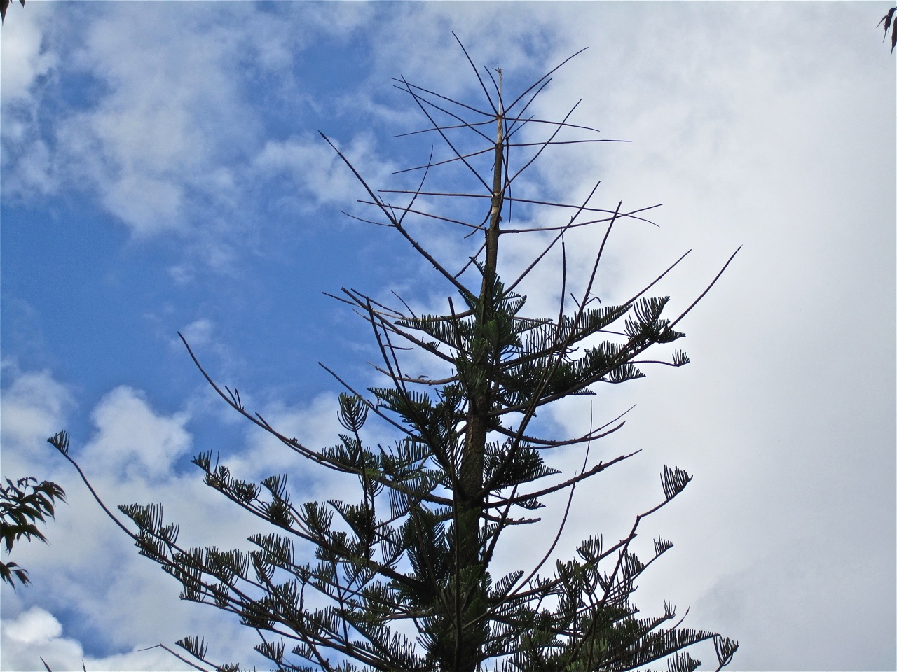 The hedge is made up of plumbago, lantana and other flowering plants, but the blooms are mostly sheared off.   In center of the planting bed is a tall Norfolk pine and a rather skimpy assortment of small roses, asters (I think), lirope, coleus, and a bird of paradise.