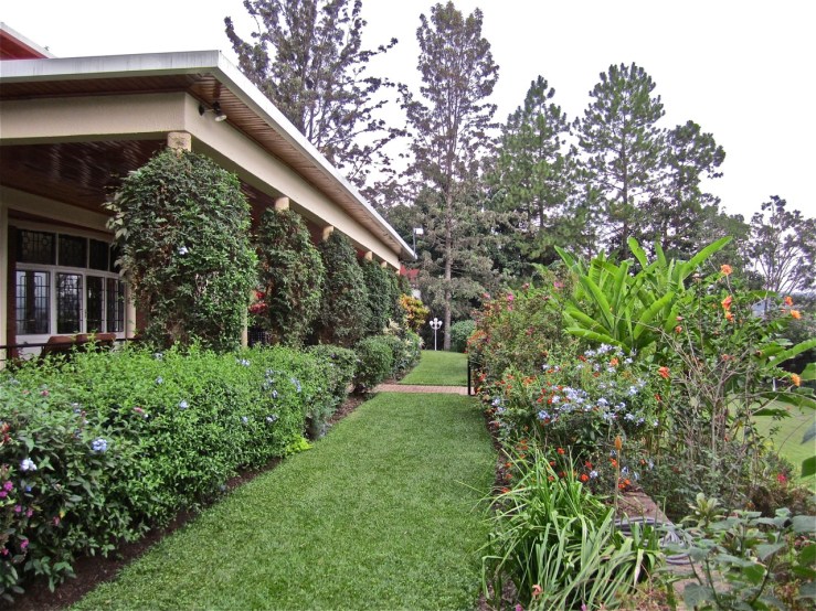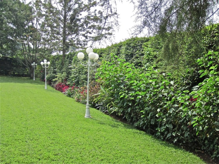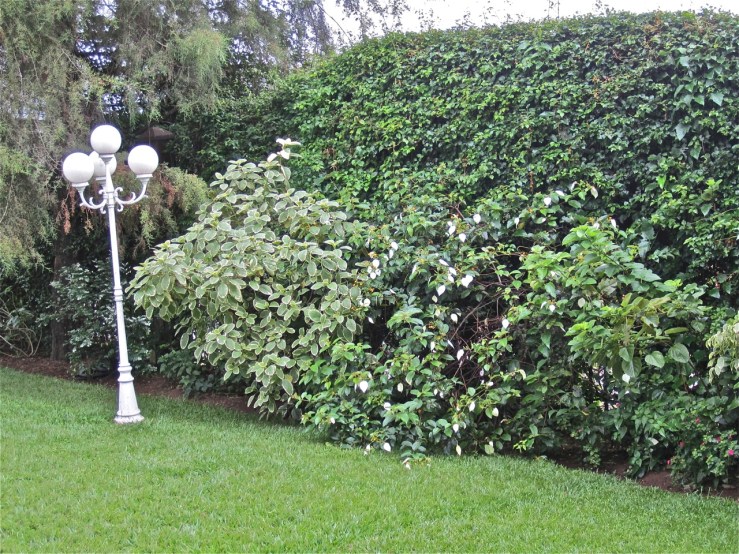 If you step through this area, you’ll be on a long terrace along the front of the house.  As you can see in the photo below, in  front of the terrace are two rows of (mostly) clipped shrubs and a path of grass between them.  Plumbago and jasmine are growing up the house columns.  The vines and shrubs attract colorful little birds right up to the terrace.  However, the vines on the backsides of the columns are bare and brown from constant shearing and a lack of light.