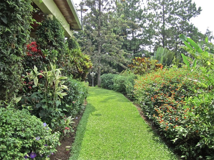 While the arrangement is rather pretty, the grass path serves little purpose — it’s mostly blocked by the shrubs on one end, and it’s too narrow for seating.  The tall plants on the right in the picture above — particularly the 6’+ lobster claws (Heliconia rostrata) — obscure the view of the hills and the city.