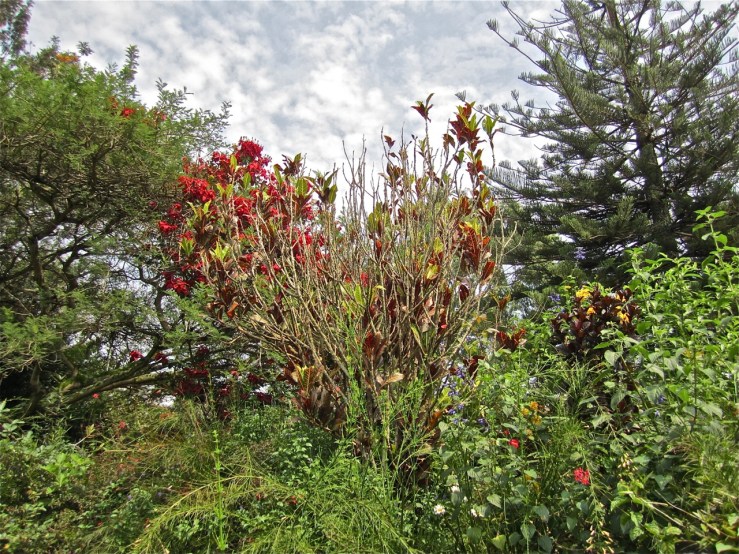 The planting beds at the top of the lower retaining walls are full  of great plants, but it’s a real thicket in there.  I have sometimes found three shrubs growing out of the same 8″ spot of ground.  And this old croton (above) is so overgrown that it’s lost half its leaves.  And at its current height, you look up onto the undersides of the remaining leaves, rather than down onto the colorful tops.