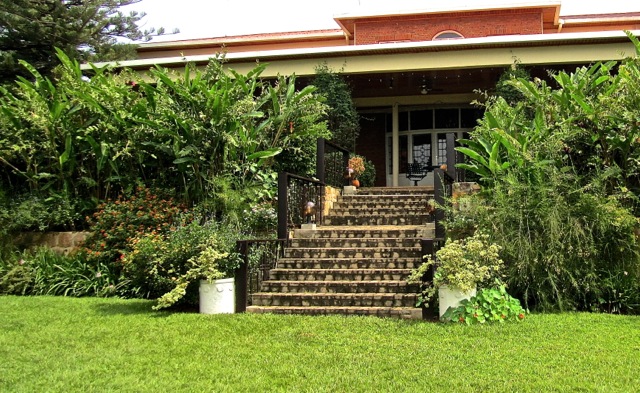Looking right across the semi-circle, below, you see a beautiful  spreading acacia tree, but its impact is obscured by the shrubs and plants growing along the edge of the drive.