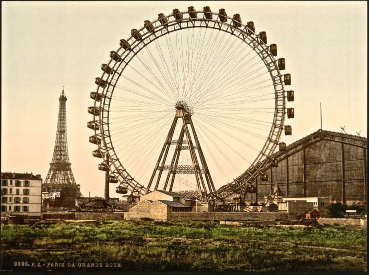 A ferris wheel (la grande roue) in Paris, near the Eiffel Tower, ca. 1890-1900.