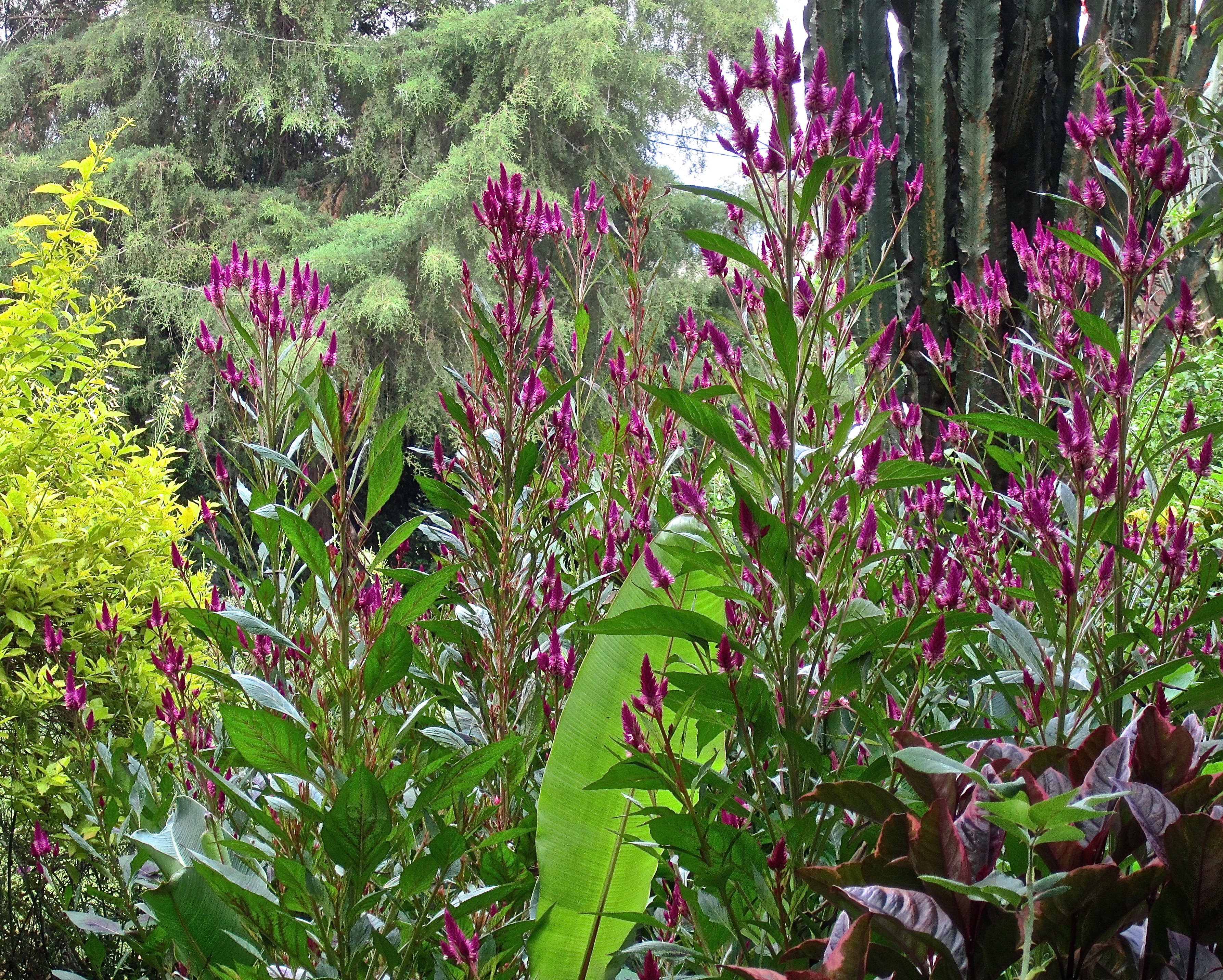 This Bloom Day, I’m most taken with this stand of Celosia argentea.  The annual self-seeded all over the garden, and we transplanted a number of the babies to this spot at the southeast end of the two parallel retaining walls (see garden plan here).