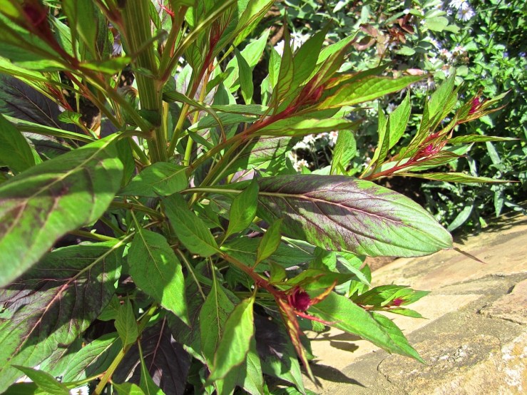 I believe my plants are a red-leafed Celosia argentea var. argentea, which is commonly know in Africa as Lagos spinach.  (Although I may have var. spicata, similar to ‘Flamingo Feathers.’)  Harvested before it flowers, the plant is an important leaf vegetable in tropical Africa and Southeast Asia.  In Nigeria, it is called soko yokoto, which means ‘make husbands fat and happy.’  In Swahili, it’s called mfungu.