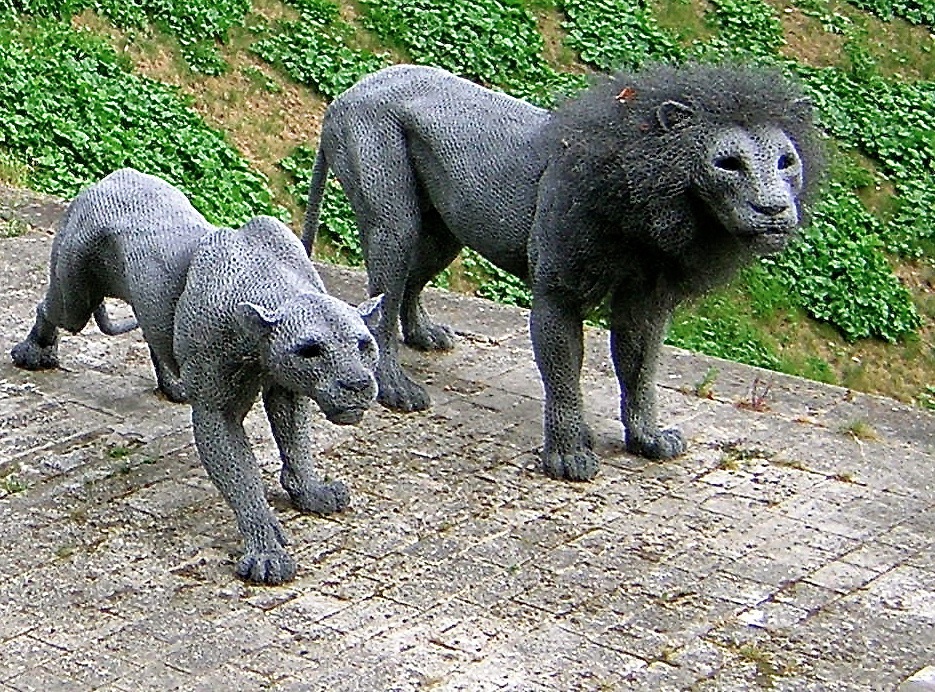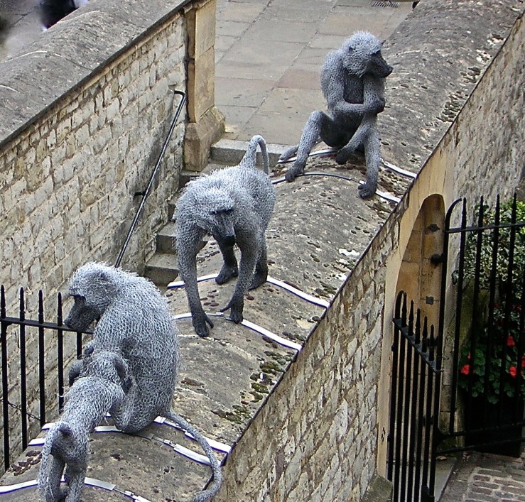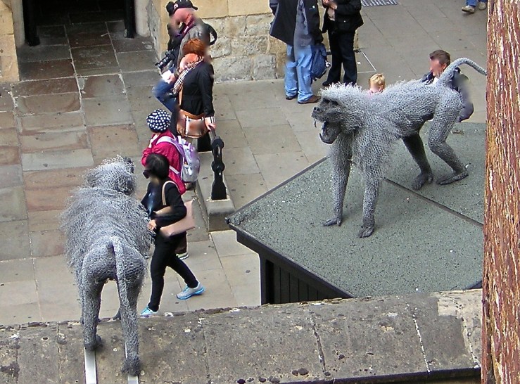 The baboons, lions, elephant, and polar bear are remarkably life-like, especially considering that they are made out of chicken wire (with a steel armature within). Haste was commissioned to create the animals in 2010, and they were installed in 2011 as part of the Tower’s “Royal Beasts” exhibit. They will remain in place for 10 years.