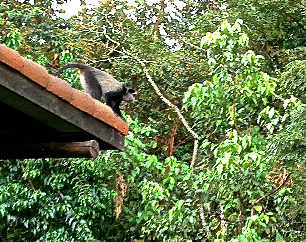 Just before tea time, we were rewarded for our indolence by finding about a dozen blue monkeys in the trees right outside our cabin’s back patios.