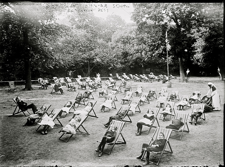Open-air school in London, Library of Congress“Children in chairs on lawn during afternoon rest, London County Open-air School.”