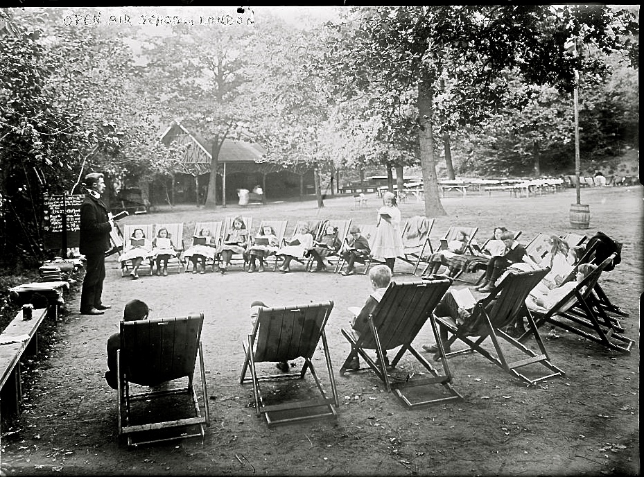 Open-air school, London, Library of Congress“Class on lawn, children in chairs, London Open-air School.”