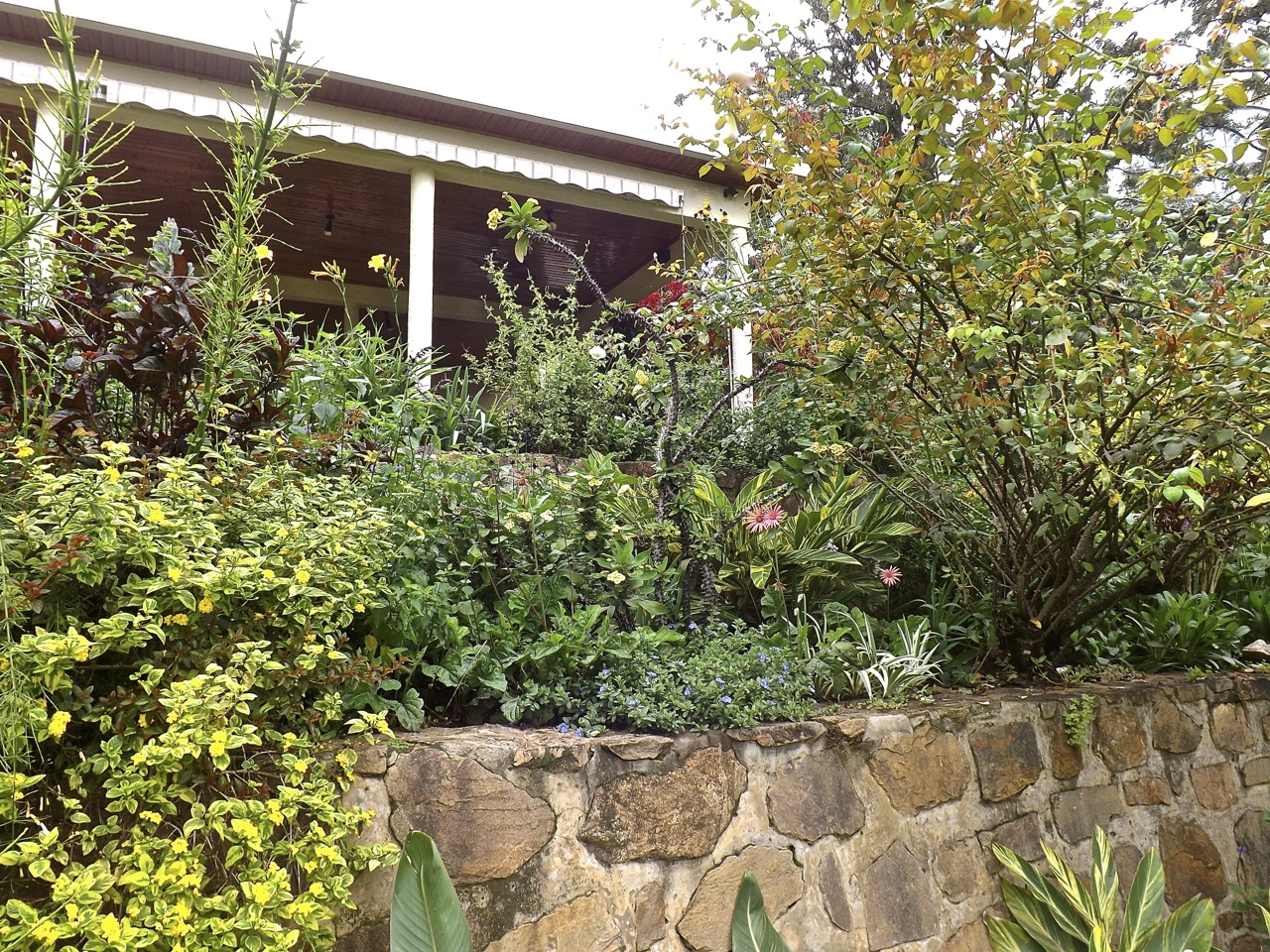 There are also a number of plants with variegated or burgundy or bronze foliage interspersed throughout. Everything just needs a little more growing time, but it’s been raining almost daily this month (we never really had much of a winter dry season), so I’ll see a lot of change when I get back.