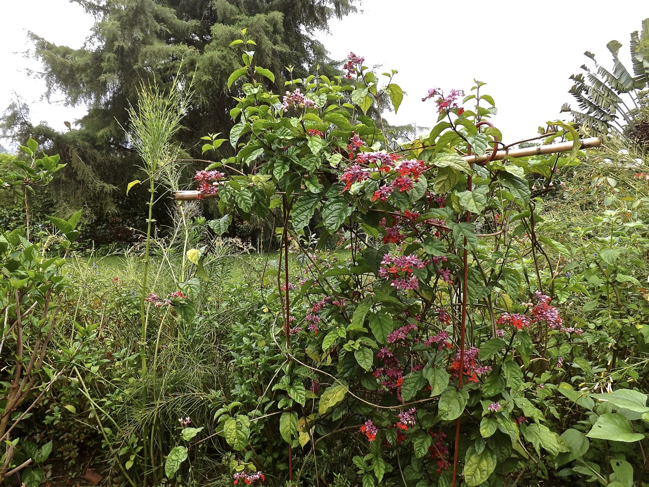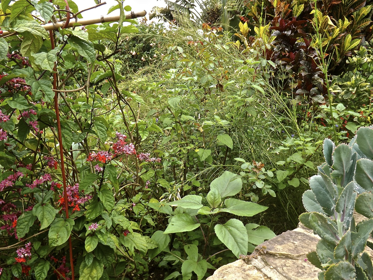 Above and below is a Clerodendrum thomsoniae var. delectum vine growing on plant supports in the upper bed between the two retaining walls. You can also see the top of one of four burgundy-flowered sunflowers that are coming up in this mostly red (with some pink) section.