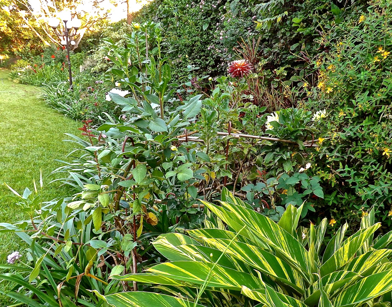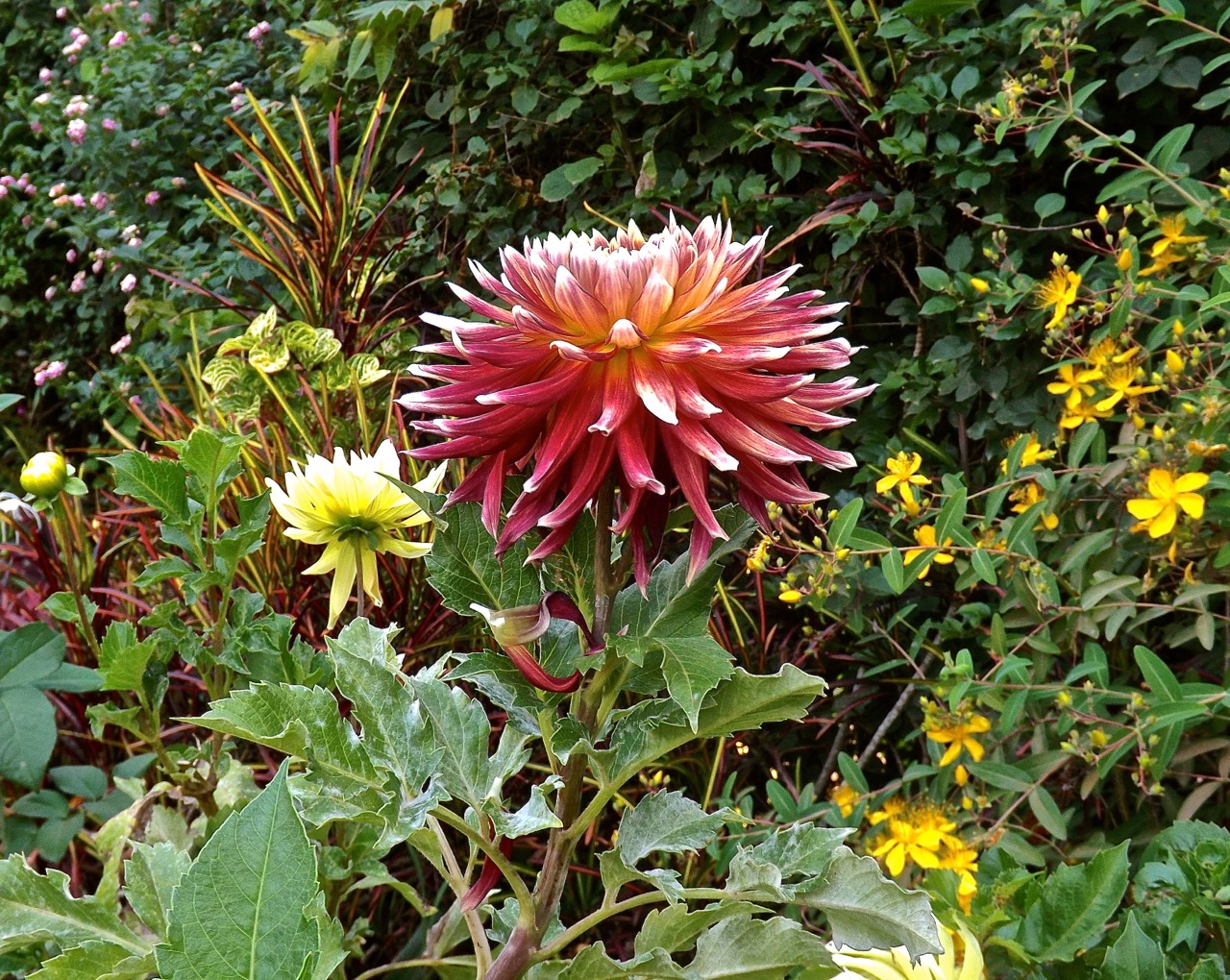 Growing behind the dahlias and blooming all the time is a shrubby Hypericum, possibly H. perforatum or St. John’s wort.