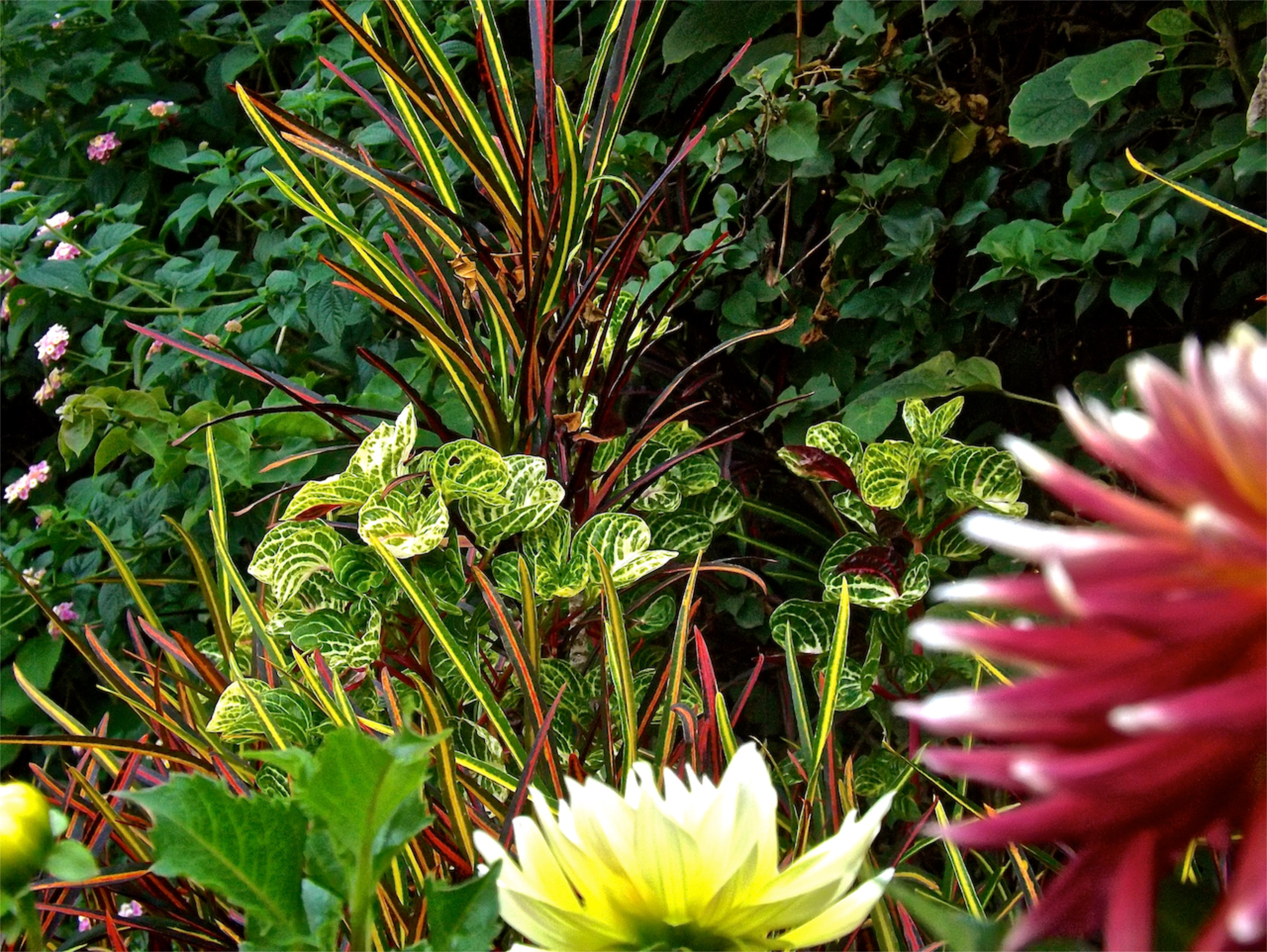 Their bi-color streakiness will go well with the red, yellow, and green tropical foliage of the plants pictured above* and with the yellow and green variegated gingers below on the left.