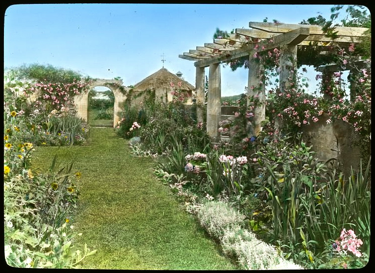 Now the land between the walled garden and the ocean is filled with newer houses and gardens, and there is a very tall hedge just behind the far wall and the pergola.
