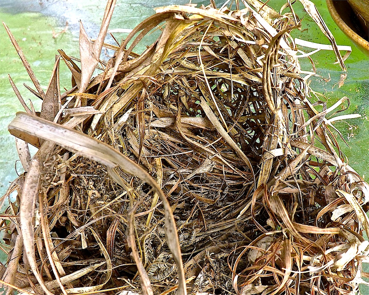Above: I pulled this one apart — which was not easy — to see how many of my garden plants I could identify. I see pine needles, some acacia tree leaves, and lemongrass. They may have also pulled strips off the leaves of the traveler’s palms and the heliconias.