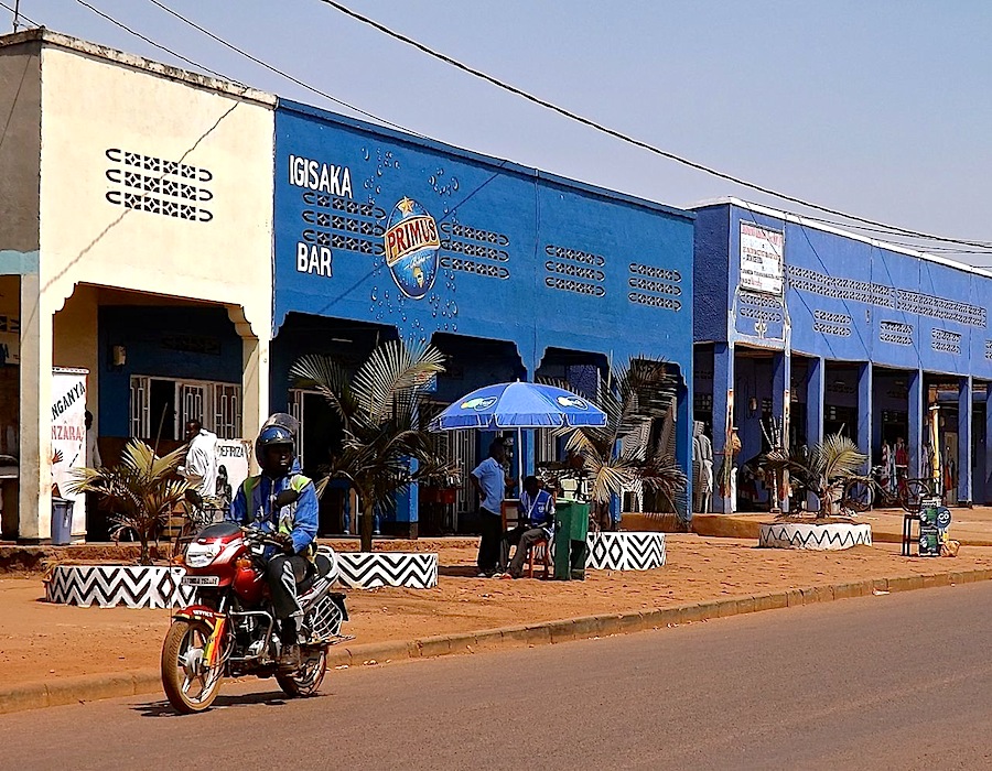 While traveling in southeastern Rwanda on Thursday, we stopped for lunch in Nyakarambi. I liked the town’s roadside planters, which are painted in the graphic patterns of imigongo art.