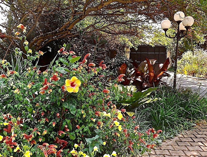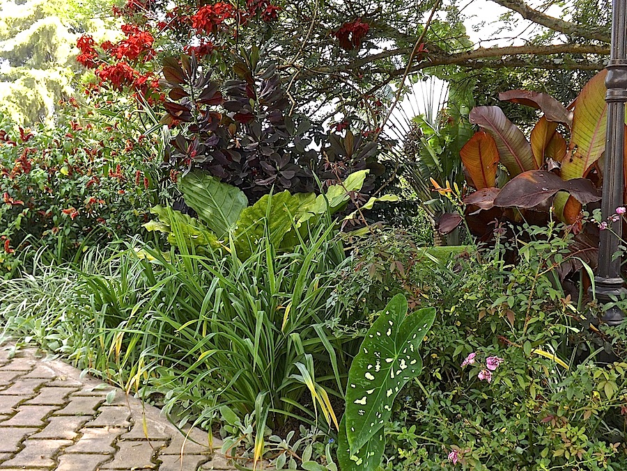 I thought I would give you a look at the plants surrounding the hibiscus and shrimp plants from yesterday’s Bloom Day.