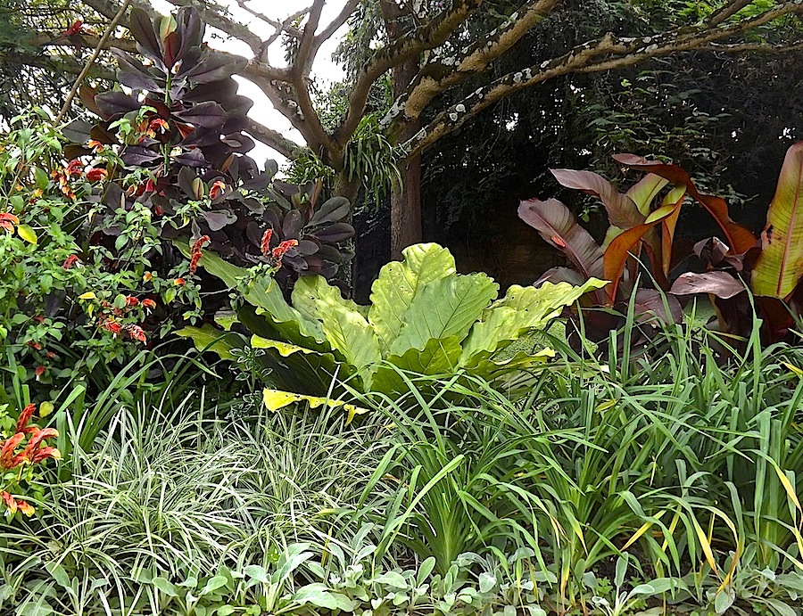 First, I would be grateful if anyone could identify the tropical plant with the very large leaves in the center above — and below with clover poking up through the leaves.