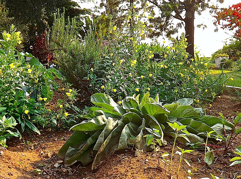 The plant is something of a roadside weed in the mid-Atlantic region of the U.S., but it can send up a yellow flower stalk to 10′ tall. The garden writer, Henry Mitchell* liked tall mulleins so much that he wrote, “O for a lute of fire to sing their merits.”
