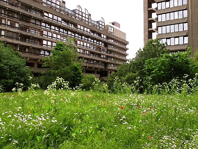 Fann Street Wildlife Garden, a private residents’ garden in Barbican Estate, London, by David Hawgood. The garden includes a meadow, nest boxes, a pond, and old logs for insects.