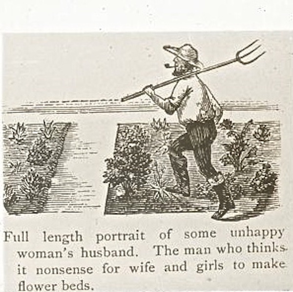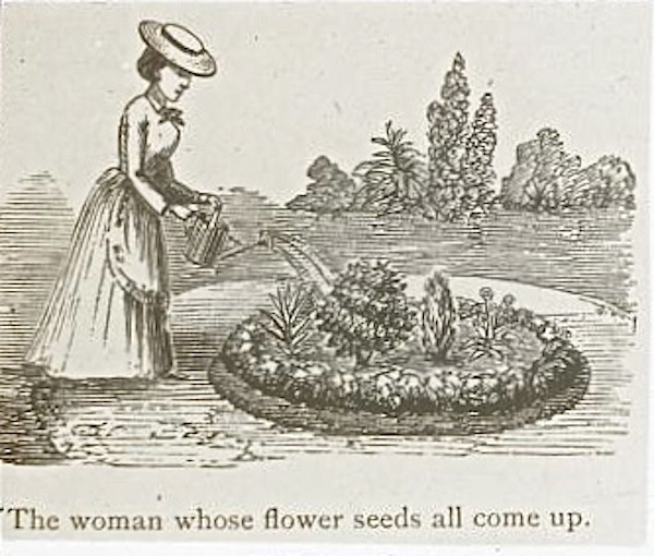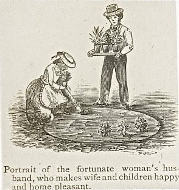 The successful lady gardener dresses in modest clothes with sensible hat and apron and stays home to care for her flowers.