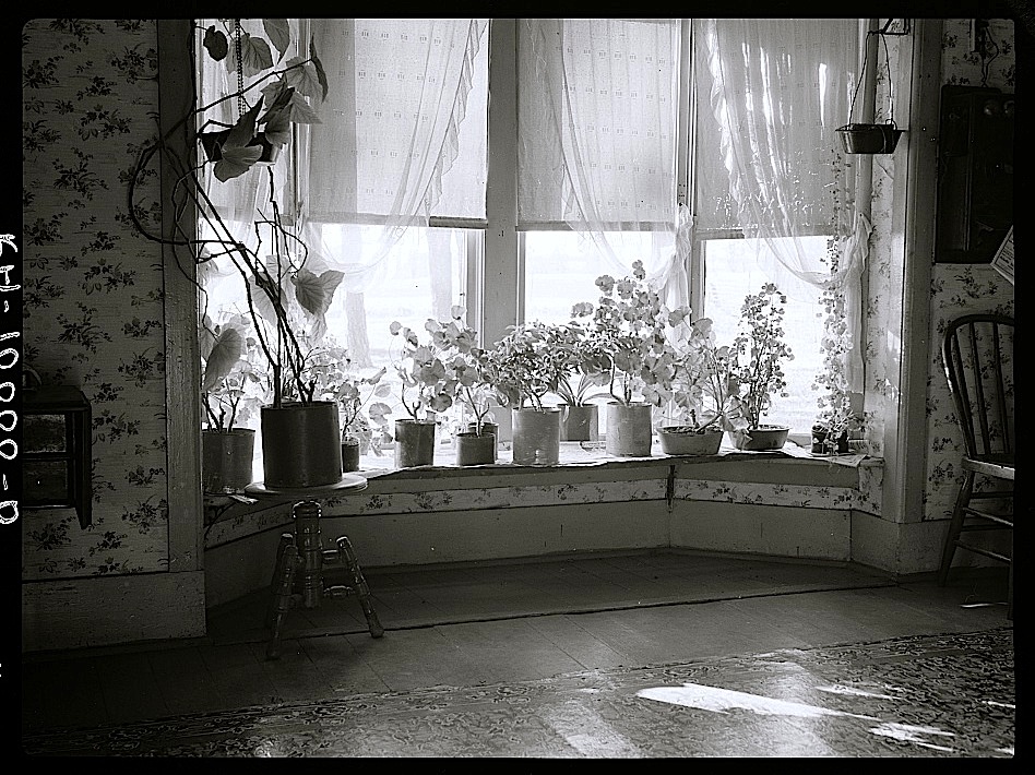 “Window of farmhouse living room. Mercer County, Illinois. Hired man lives in house on farm which was formerly residence of owner-operator,” November 1936. Photo and caption by Russell Lee, via Library of Congress Prints and Photographs Division.