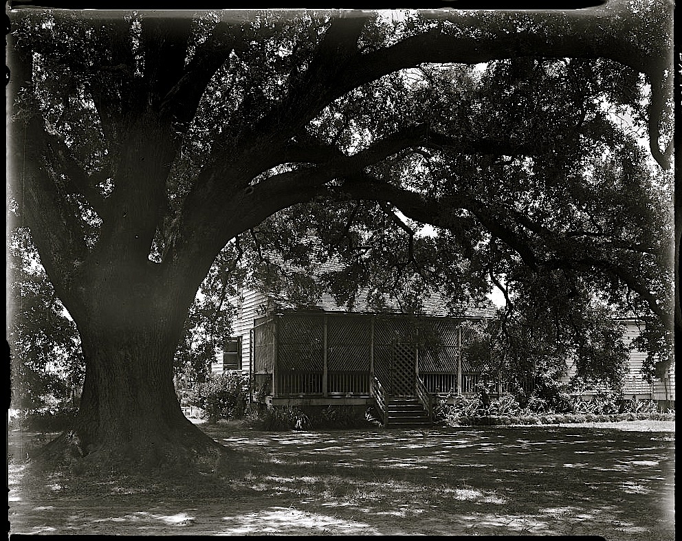 A 2003  Historic American Buildings Survey (HABS) drawing of the property seems to indicate that the enormous Quercus Virginiana or live oak tree at the right in the top photo was still standing at that time. Over 15 live oaks are shown in the area immediately in front of the house.