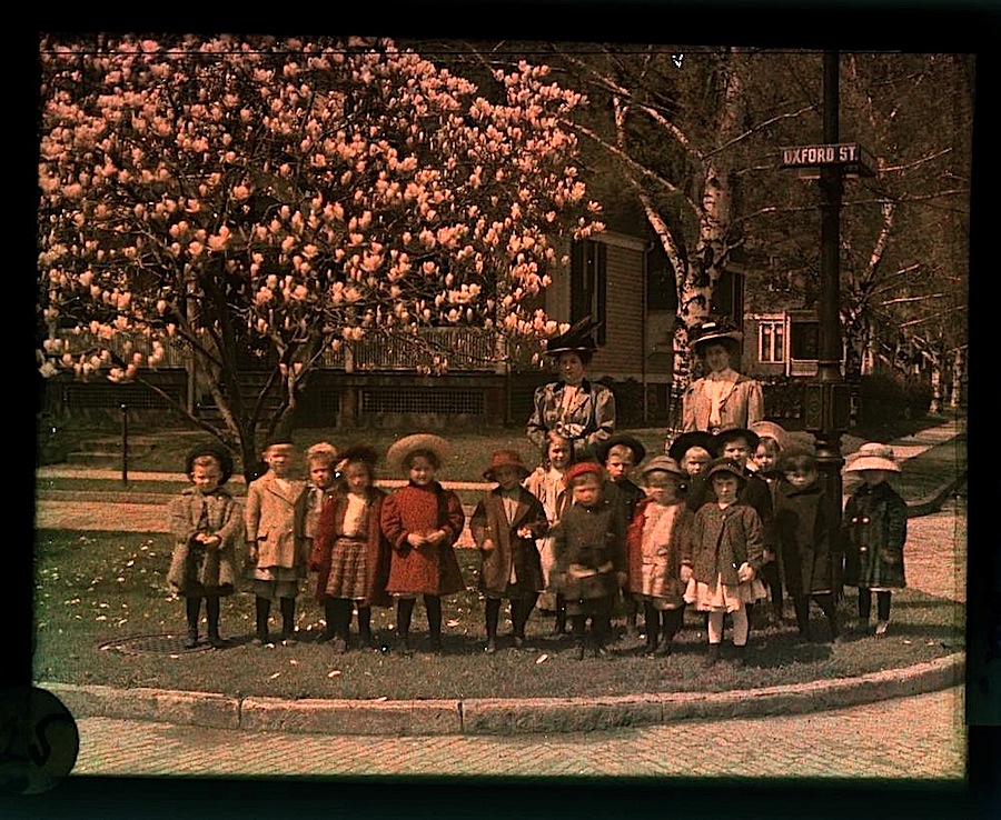 “Schoolchildren with teachers under Magnolia trees on Oxford* Street,” c. 1910, an autochrome by Charles C. Zoller, via George Eastman House Collection on flickr.