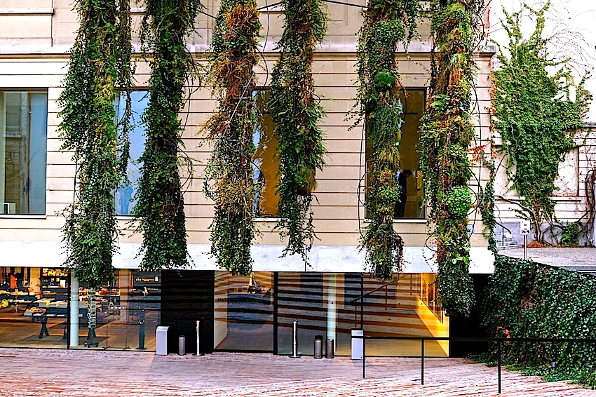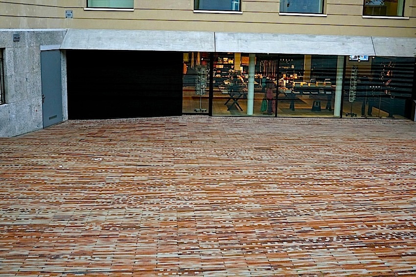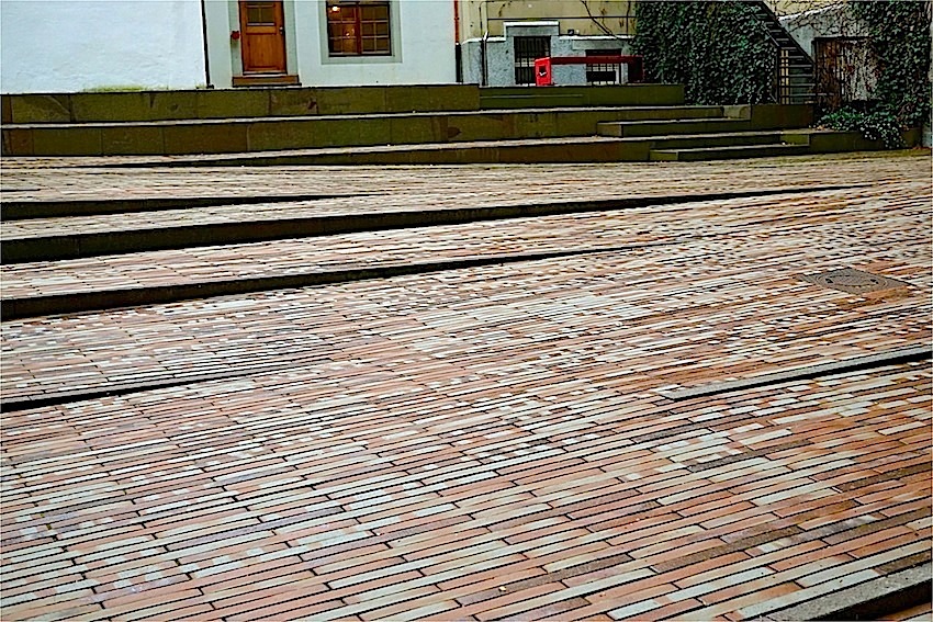 After I took a number of photos of the hanging plant columns of the Basel Museum of Culture (during our visit at Thanksgiving), I turned my attention to the courtyard around them — the Schürhof — the floor of which is largely a set of low, wide steps descending to the museum lobby and gift shop.