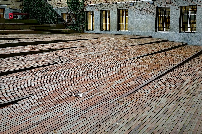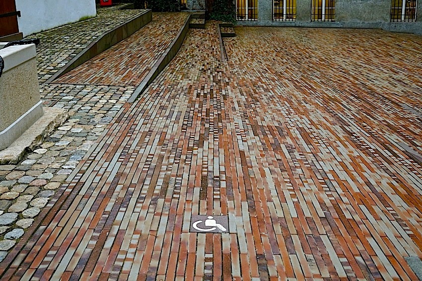 Note the white symbol of access in the brick pavement.
