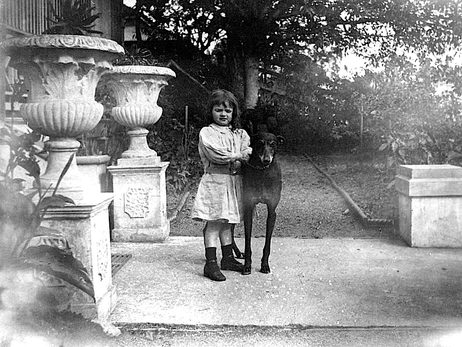 Margaret Granville Wandooline (“Wanda”) Stuart . . . posing with “Garrick” at her home in Toowong, Brisbane, Queensland, 1899, photographer unknown, via State Library of Queensland Commons on flickr.