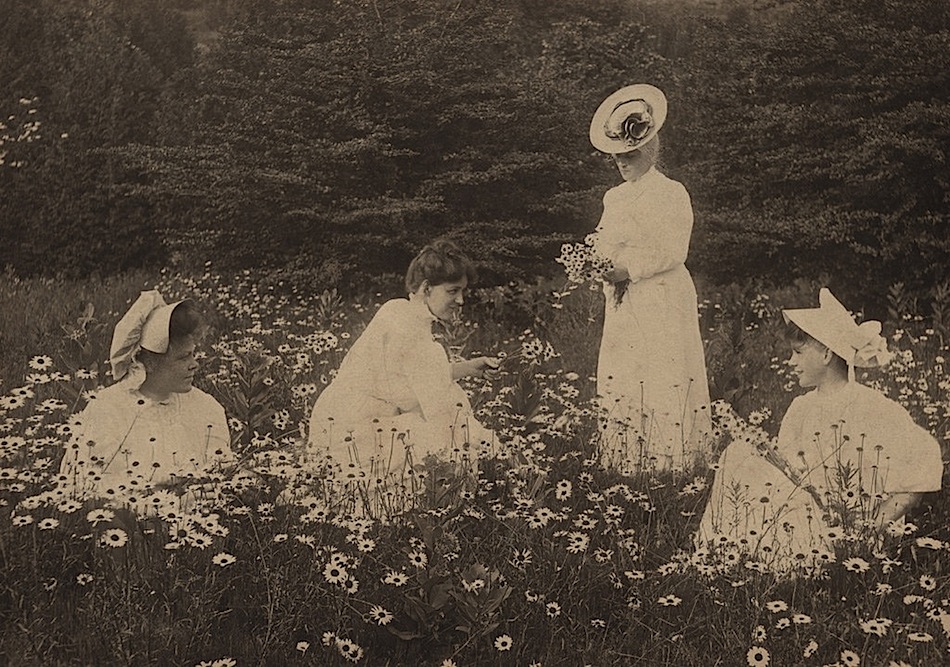 Floe Sallows Saunders, Floe Sallows, Emma Combs Fillman, Lottie Green Langell in a field of flowers in Bayfield, Ontario, date unknown, by Reuben R. Sallows, via Huron County Museum & Historic Gaol Commons on flickr.