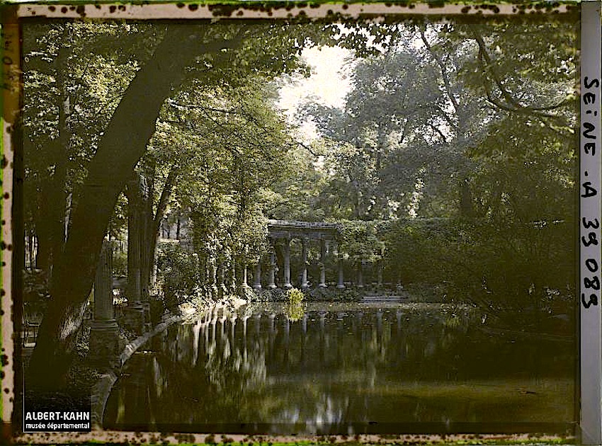 Colonnade dans le parc Monceau, la Naumachie, Paris (VIIIe arr.), France, 12 septembre 1923, (Autochrome, 9 x 12 cm), Auguste Léon, Département des Hauts-de-Seine, musée Albert-Kahn, Archives de la Planète, A 39 095 S