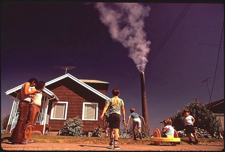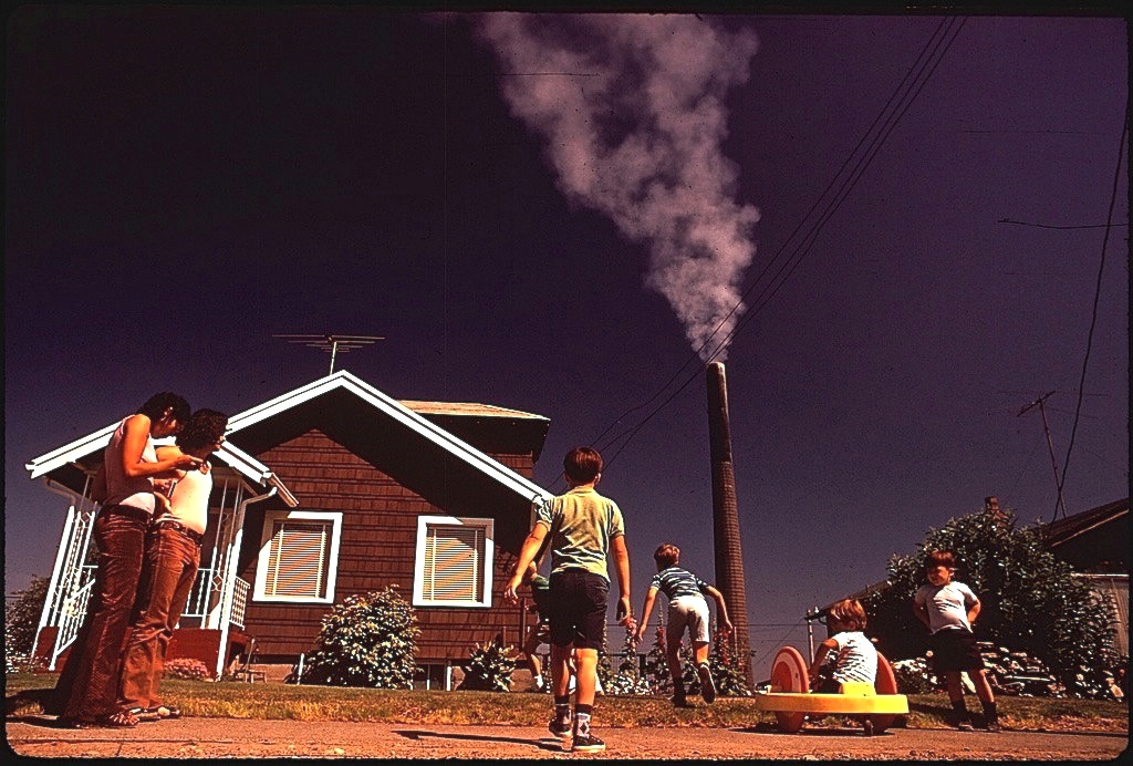 “Children play in yard of Ruston home, while Tacoma smelter stack showers area with arsenic and lead residue,” August 1972, via The U.S. National Archives Commons on flickr.