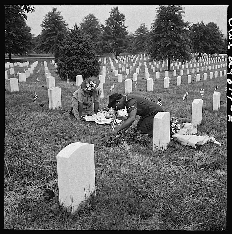 “Decorating a soldier’s grave in one of the Negro sections on Memorial Day [1943],” Arlington Cemetery, Virginia, by Esther Bubley, via Library of Congress Prints and Photographs Division.