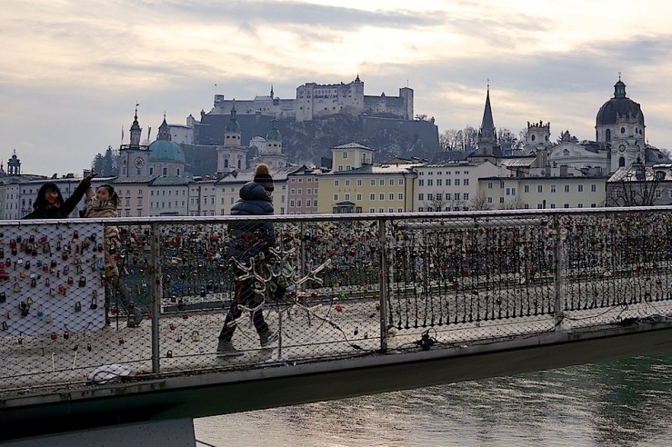 Salzburg’s old city center from a pedestrian bridge. Note The Sound of Music “do-re-me” reenactment on the left side.