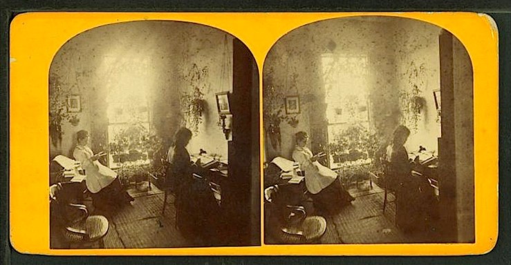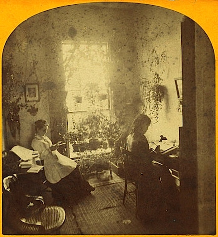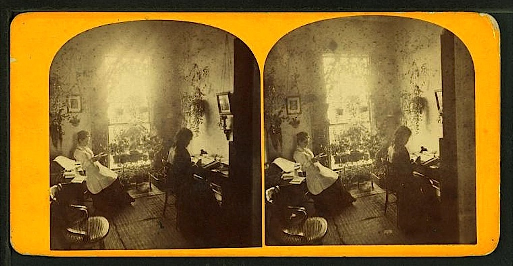 Proofreader Sophie Baldwin and another woman at work in her office decorated with many potted plants and vines, Cambridge, Massachusetts, 1901, a stereograph by Thomas R. Lewis, via New York Public Library Digital Collections.