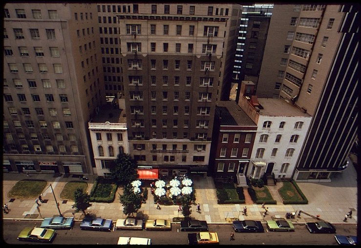 Small front gardens and a sidewalk cafe on 17th Street, N.W., between H and I Streets, August 1973, by Dick Swanson for DOCUMERICA, via The U.S. National Archives Commons on flickr.