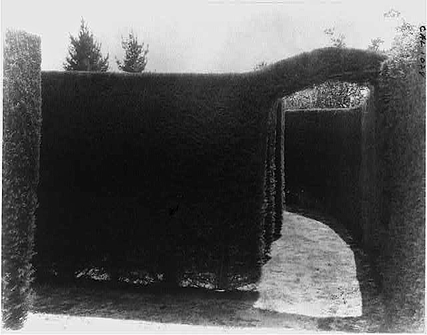 The Bothin’s fortune was made in coffee and spices (San Francisco), real estate, and water. Their estate became famous in the 1920s for the parties and performances held in its 350-acre “Tea Gardens” — which included the clipped cypress theater shown here.