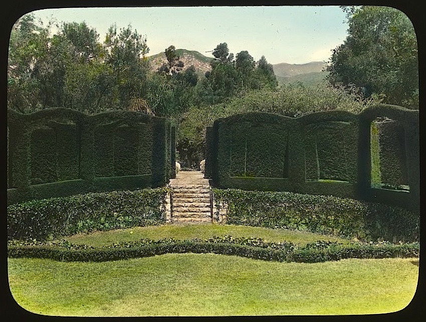 The outdoor theater of the Piranhurst estate of Henry Ernest and Ellen Chabot Bothin, Montecito, California, 1917, hand-colored glass lantern slides by Frances Benjamin Johnston, via Library of Congress Prints and Photographs Division.