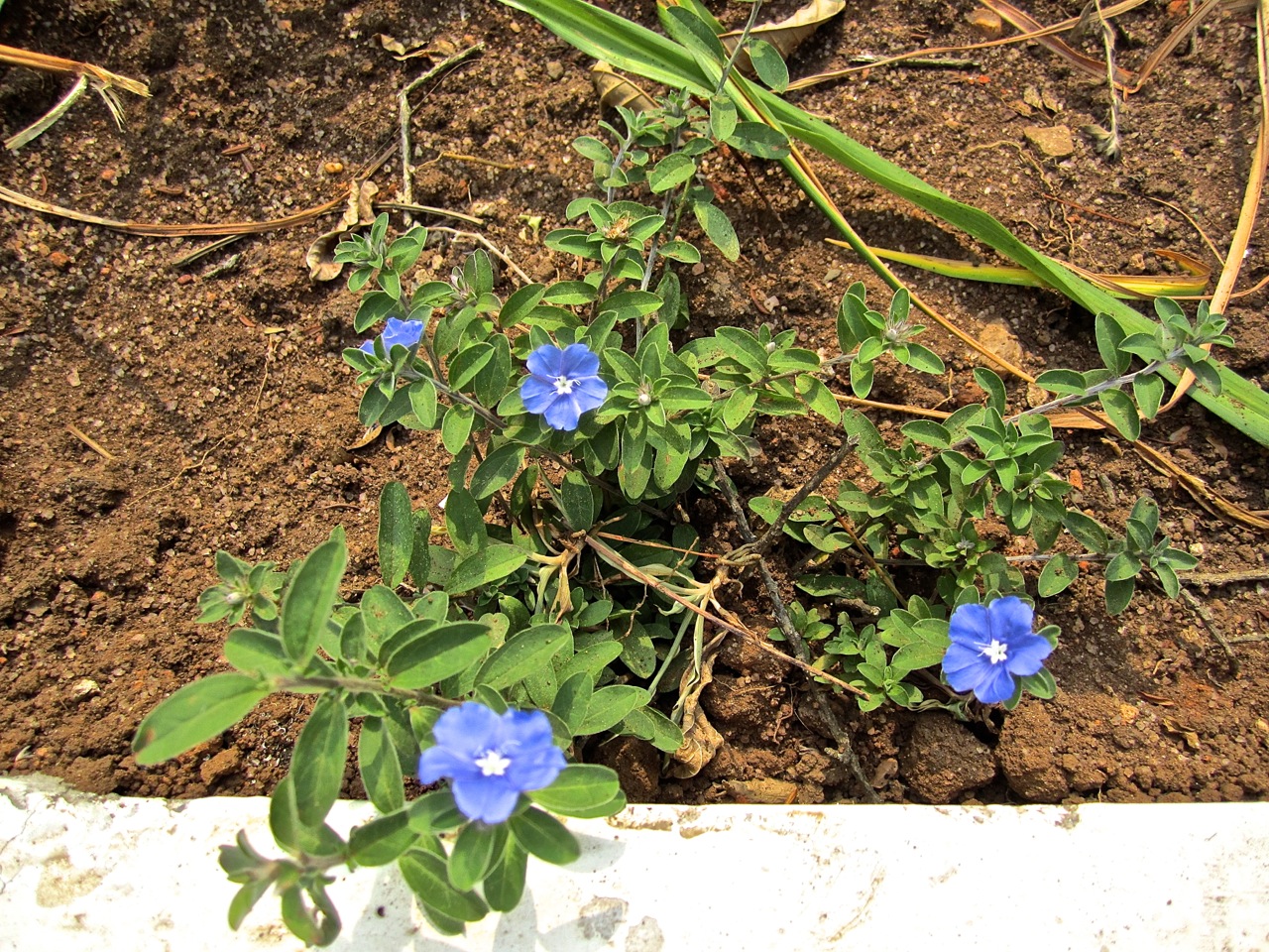 I planted yellow-blooming day lilies, Rudbeckia laciniata, and roses in the narrow border along the top of the stone retaining wall — and mainly blue and purple-blue flowering plants in the bed just below.