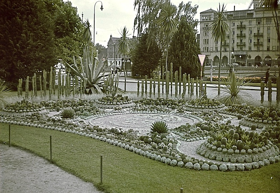 Kaktusplanteringen (cactus planting) in Karl Johan Park in Norrköping, Sweden, 1942, a color slide by Fredrik Bruno, via Swedish National Heritage Board Commons on flickr.